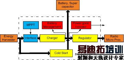 图 1 显示了能源采集系统的一般架构。该总系统由自然能电源、能量缓冲器(超级电容器/电池)、电源管理集成电路 (PMIC) 和系统负载组成。由于能源可用能量取决于随时间变化的环境条件,因此获取能源能量后存储于能量缓冲器。系统负载通过能量缓冲器供电驱动。这样做可让系统在没有可用自然能的情况下仍然能够正常工作。电源管理单元由一个 DC/DC 功率转换器(能源采集器接口经过优化)、电池管理电路、输出稳压器和冷启动单元组成。接下来,我们将逐一讨论这些模块的功能和设计考虑因素。