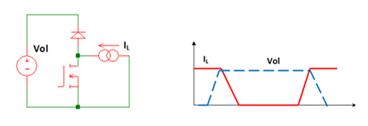 MOSFET开关关断时,它两端的电压将上升。然而,电流IL将继续流过MOSFET,直到开关电压到达Vol。二极管导通后,电流IL开始下降。MOSFET开关导通时,情况相反,如图所示。这类开关称为“硬开关”。开关瞬变期间,必须同时支持最大电压和最大电流。因此,这种“硬开关”会使MOSFET开关承受高电压应力。