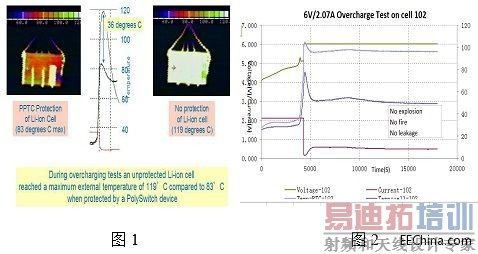 下图1中示意了在锂离子电池过充测试中有加PTC和不加PTC情况下的温度变化的对比: