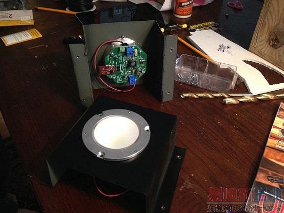 图4所示为杂物间,安装有一个23 W 日光灯和一个10 W LMH - 2 。LMH-2产生的光稍微暗一点,并且非常不幸的是,由于我没有漫射光线的灯罩,导致光线集中向下。灯具为弯曲、穿孔、上了漆的0.032”铝制品,用来固定LMH-2灯具并提供小型散热区域。该系统的热管理非常简单,原因是光源发的热只有5W,而电源大约为2W;另外,晚间温度在夏天约为20℃,在冬天为10℃。