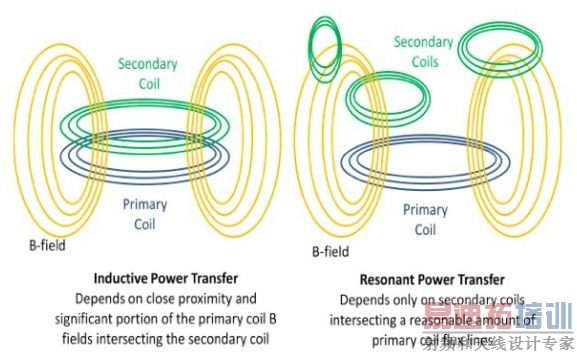 上图的比较显示感应无线充电和谐振无线充电两者之间的差异(参考文献7)。