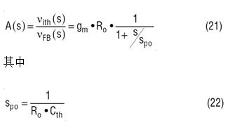 ITH 补偿 A(s) 是环路补偿设计中最关键的一步,因为这一步决定 DC 增益、交叉频率 (带宽) 和电源电压环路的相位 / 增益裕度。就一个电流源输出、gm 跨导型放大器而言,其转移函数 A(s) 由等式 18 给出: