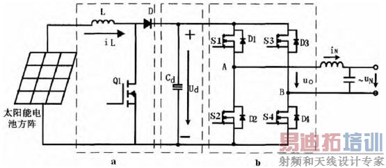 逆变器的主电路结构按照输出的隔离形式分为工频变压器隔离方式,高频变压器隔离方式,非隔离3 方式种。采用工频变压器进行隔离的逆变器,具有良好的抗雷击和消除尖波的性能,电路简单,变换只有一级,但是主变压器和滤波电感体积大。采用高频变压器的逆变器比工频变压器隔离的逆变器体积小,重量轻,成本低。但是,经多级变换,回路较为复杂,效率问题比较突出。了进一步降低成本,提高效率,采用无变压器无隔离方式逆变器主电路,如图1 所示,其中(a)部分电路为为boost 升压电路,(b)部分电路为全桥逆变电路。