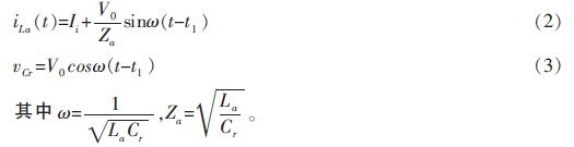 在此开关模态中,La开始与电容Cr谐振,iLa继续上升, 而Cr的电压vCr开始下降。iLa和vCr分别为: