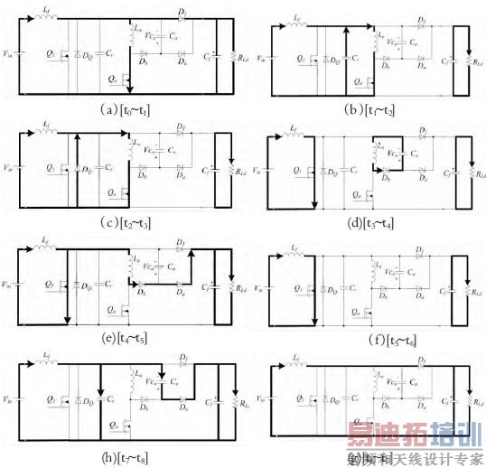 ZVT Boost 电路主要有8 种工作模态, 各工作模态对应的等效电路如图4 所示。