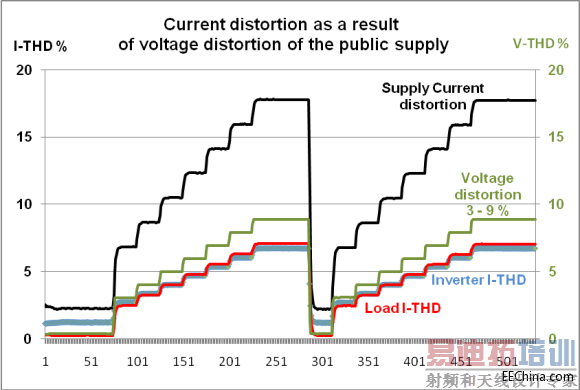 如图4所示,注入电网的电流失真大约是设置的电压失真的两倍。这是由于逆变器“追踪”电网的电压,叠加上了与电压失真程度相同的电流失真。