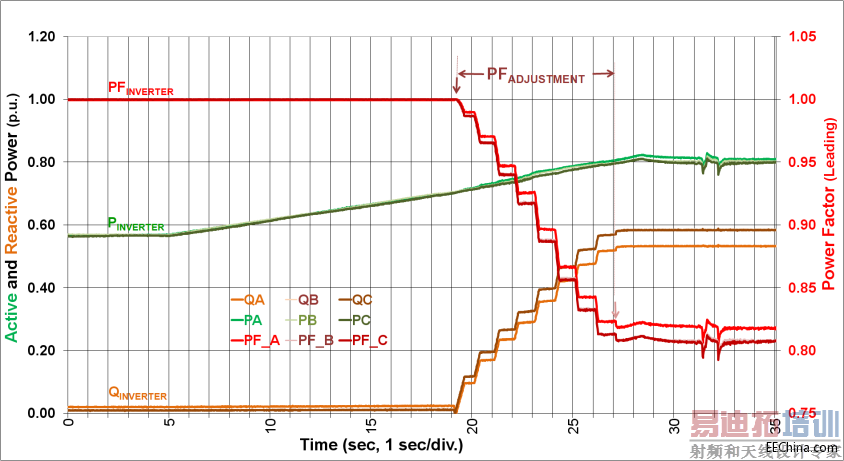 作为这种低压/高压支撑功能的一部分,高级逆变器可以调整其功率因子。如图9所示,逆变器根据其功率输出来调整功率因子,在本例中其功率因子从60%输出功率时的1.00变化到了80%输出时的0.8。