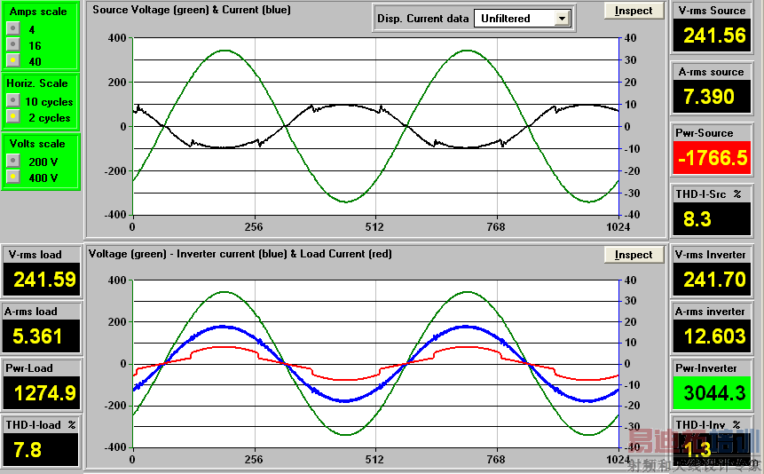 图2展示了功率分析仪上的典型显示。上方的图形是电网模拟器即电网端的电压(绿色)和电流(黑色)波形,下方的图形是负载的电流(红色)和逆变器的电流(蓝色)。逆变器输出1274.9瓦给家用负载,输出1766.5瓦给电网。