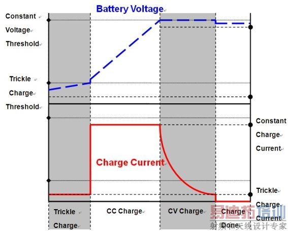 锂电池对充电要求很高,需要精密的充电电路以保证充电的安全,尤其要求终止充电电压精度在额定值的±0.5%之内。目前锂电池充电最常采用三段充电法,即预先充电模式(Trickle Charge Mode)、定电流充电模式(Constant Current Charge Mode)、定电压充电模式(Constant Voltage Charge Mode)。充电IC在充电前会侦测电池的状态,若电池电压大于3V,将以定电流充电模式充电;若电池电压低于3V,则以预先充电模式(约10%的定电流充电模式充电电流) 充电,到接近终止电压时,改为定电压模式充电,此时电池电压几乎不变,但充电电流会持续下降,当充电电流降到某一值时(约10%的定电流充电模式充电电流),充电电流会被关闭,完成充电。图5所示为采用三段充电法的锂电池充电特性曲线。