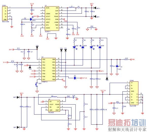 本文所介绍的移动电源电路中,MCU的主要功能为输入电压侦测、输出电压侦测、电池电量状况显示以及输出过电流保护等。电路中,LED将显示电池的电量,可以让使用者知道电池的电量状况。而当输入及输出电压过高或过低时,MCU会送出讯号关闭IC;另外,当发生输出过电流时,MCU也会关闭IC来保护电池及IC。