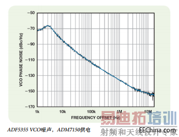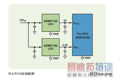 本示例显示集成VCO的微波宽带频率合成器ADF5355,由超低噪声LDO ADM7150为其供电。