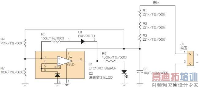 本设计实例中使用了LTC1540CS8组合纳米功率比较器和基准,当存在高压时,高亮度LED就会闪烁。在高电压情况下,LED快速闪烁;在低压情况下,LED闪烁速度减慢。由于LED的占空比较小,电流消耗也很低。即使在光照良好的情况下,高亮度LED也能引起人们的注意。[ 点击查看全文 ]