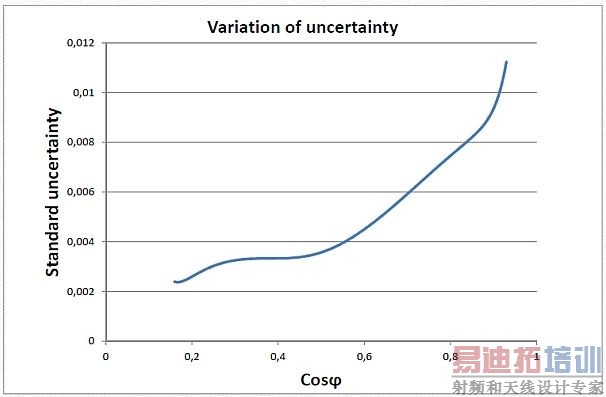 鉴于不确定度趋势在cosφ变化点的行为,决定将不确定度分为两个间隔;举例来说,将1.2%的不确定度u用于电流读取,k=2时与cos测量相关的扩展不确定度是: