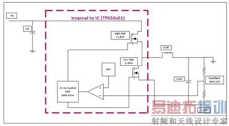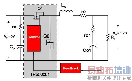 在输出电压大于输入电压的应用中,TPS50x01 可配制为快速降压 (Fly-Buck) 转换器。图 3 是一种零部件数量较少的简单降压型设计。