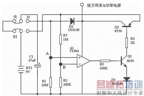 其工作过程是:当把开关S1置于“关”时9V电池对电容C1充电。使得C1两端的电压等于电池电压。当把S1置于“开”时,电容C1接至运放的同相输入端(A),同时也通过R1放电。R2和R5分压得到约1.5V的电压加至运放的反相输入端(B),刚开机时电压A>B,运放输出高电平。这说使用Q1和Q2都导通,通过Q2的集电极输出9V电压。万用极工作。