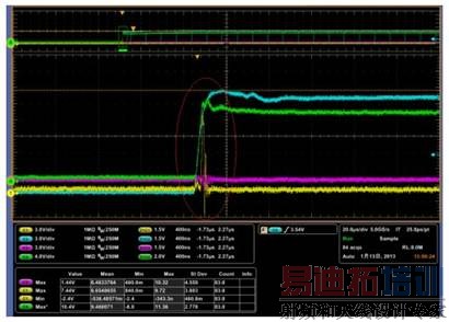 实际测试上述电源系统时发现,开机时 UCC27201 的 HO 引脚有误脉冲,如图 4 (CH1 为 HO;CH4 为 HB 与HS 的差分电压,亦即 Cboot 电容两端的电压;CH2 为 LO;CH3 可忽略)。该误脉冲幅度最大可超过 7V,与 LO交叠后会造成全桥高端 MOSFET 和低端 MOSFET 的共通,进而导致系统开机存在风险。