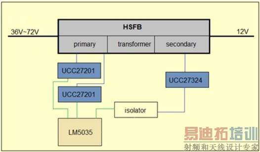 该隔离电源系统完成宽范围输入电压(36V~72V)到 12V 的转换,输出功率 350W。系统采用带同步整流功能的硬开关全桥拓扑(HSFB)。图 1 所示的是该系统的方框图,包含有主控芯片 LM5035,置于原边侧的驱动器UCC27201,置于副边侧的驱动器 UCC27324 和隔离器等器件。