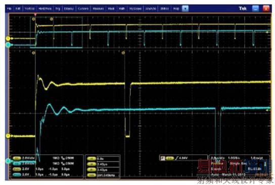 图 10 给出的是实测波形,其中 CH1 是 LO 的波形;CH2 是 HB-HS 的波形;CH3 是 HO 的波形,CH4 是 VDD的电压波形。可以看到,在 UCC27201 上电后,VDD 电压快速下降,然后又缓慢上升,这与仿真结果一致。