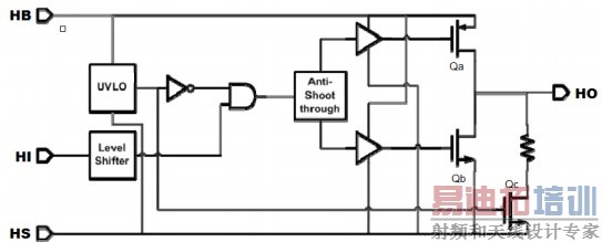当 HB 与 HS 间电压还处于欠压阶段时,内部电路会产生高电平驱动信号以导通 Qc。但是,该高电平驱动信号的产生存在一定的延时;同时,Qc 设计用来被脉冲信号触发,而非电平信号触发。上述两个因素就造成,当 HB与 HS 间电压上升过快时 Qc 将不能及时导通。此时,如果 HO 被 HB 与 HS 间电压耦合出高电平后(其中一个耦合途径是通过 Qa 和 Qb 的结电容),因 Qc 还未导通,该耦合出的高电平将得以输出,最终形成了 HO 的误脉冲。