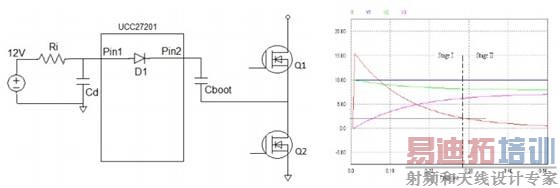 如图 7 所示,UCC27201 内部有二极管(D1)连接 Pin1 (VDD)和 Pin2(HB)。在 Pin1 的外部连接有供电网络(电压为 12V),电容 Cd(1uF)和串联电阻 Ri(10ohm);在 Pin2 则接有 Cboot 电容。Cboot 电容的充电主要是通过 D1 这条路径完成的。