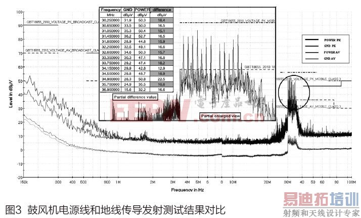 在测试期间,测试设置和测试步骤都遵循了GB 18655:2010的要求,但分析测试结果时,发现电源线传导噪声的峰值在30MHz-40MHz部分频点接近GB 18655:2010的等级3的限值要求,在34.6MHz峰值达到50.4dBμV,距离18655:2010的等级3在本频段的限值52dBμV只有1.6dBμV。而地线传导噪声的峰值却远远低于传导噪声的峰值限值。在32.6MHz峰值达到34.6dBμV,距离限值有17.4dBμV。与电源线传导噪声的测试结果差距很大,如图3所示。