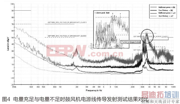 在蓄电池电量充足时,电源线传导噪声峰值在30-40MHz有五个频点超出了GB 18655:2010等级3的限值要求,测试未通过。在蓄电池电量不足时,电源线传导噪声峰值和平均值均低于GB 18655:2010等级3的限值要求,测试通过。在蓄电池电量充足与电量不足两种状态下,电源线传导噪声测试的结果截然相反。