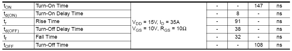 以FAIRCHILD公司的MOS为例,如表1所示:FDD8880开关时间特性表。