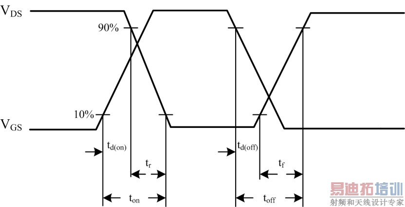 MOS管的损耗由开关损耗和驱动损耗组成,如图1所示:开通延迟时间td(on)、上升时间tr、关断延迟时间td(off)、下降时间tf。