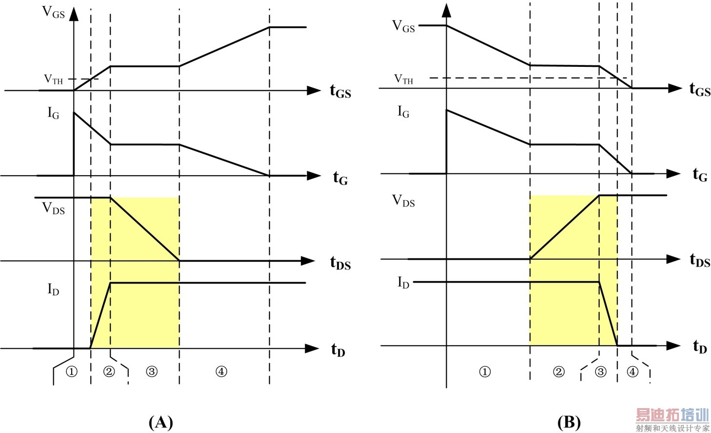 开关导通时对应的波形图如图2(A),开关截止时对应的波形图如图2(B),可以看到开关管每次导通、截止时开关管VDS电压和流过开关管的电流ID存在交叠的时间(图中黄色阴影位置),从而造成损耗P1,那么在开关频率fs工作状态下总损耗PS= P1 *fs,即开关频率提高时,开关导通与截止的次数越多,损耗也越大。