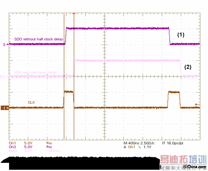 在正常情况下,SDO引脚数据在时钟信号上升沿移出。(在下面的图中,信号 (1)传播延时大约15ns)。SDO引脚数据在时钟信号下降沿移出 (在下面的图中,信号 (2)传播延时大约几纳秒 )。通过正确设置配置寄存器可开启这项功能,这在数据通道和时钟通道延时失匹的菊花链结构中特别有用(电路板走线)。在物理层时钟和数据很难同步时,SDO延时是一个快捷的解决方案。如图3所示。
