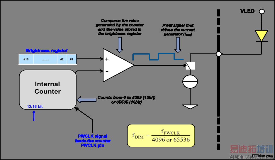 通过控制12/16位PWM灰度亮度,可调节每个通道的亮度。亮度数据通过SDI引脚装入16位移位寄存器,每个输出通道都有一个移位寄存器。输出PWM信号是比较亮度寄存器内容和16位或12 位计数器(配置寄存器选择)而产生的。计数器时钟源由PWCLK引脚提供,如图5所示。