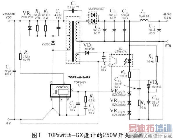 本方案选用TOP249Y设计,输出功率250W时工作于其上限功率,故要保持良好的散热条件(芯片温度要保持在110℃以下),也可用TOP250Y替换该元件。