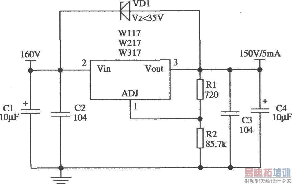 如图所示的是用W317三端可调式正集成稳压器组成提高输出电压的应用电路。目前,一般集成稳压器的输出电压均在30~35 V左右。将W317接成悬浮式电路,适当增加保护元件,可输出100 V以上的高压。图示电路的输出电压为l50 V。通常,增大R2的阻值,即可提高输出电压。但稳压器本身能承受的电压并不高,输出电压大部分施加在R2上。为了防止启动瞬间稳压器承受过高电压,故在输入与输出间采用了保护稳压二极管VD1,但该稳压二极管的极限值应小于W317的耐压值(例如小于35V)。图中R1为720Ω,R2为85.7 kΩ。该电路不能在空载情况下应用,若要求空载时保持稳压,则Rl不能超过240Ω,但这时R2的功耗很大,应用中需注意这个问题。