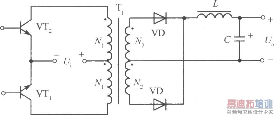 推挽式变换电路属于双端式变换电路。其高频变压器工作于磁滞回线的两侧,是一种设计简单、工作合理的线路,适用范围比较广。其典型电路如图所示。开关晶体管VT1、VT2由基极驱动电路激励交替导通与截止,输入直流电压Ui变换成高频方波交流电压。VT1导通时,Ui通过VT1加到变压器T1的初级绕组Nl上。由于变压器的作用,因此截止的晶体管VT2将施加于2倍的输入电压,即2Ui。当基极激励消失时,VT1、VT2管均截止。其集电极施加的电压均为输入电压Ui。下半个周期,VT2导通,VT1截止,VT1施加2倍的输入电压,接着又是两管截止,下一个周期重新开始。推挽式电路的主要缺点是开关晶体管的耐压要达到2倍的输入电源。电压的峰值,以220(1±10%)V的电网电压为例,稳态截止电压的最大值为680V,加上动态过程中的尖峰电压,开关晶体管必须要承受800V以上的电压。