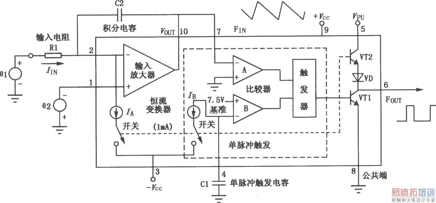 VFC62单片电压/频率和频率/电压转换器能简单地将模拟信号转换成数字信号,数字脉冲串重复率正比于模拟输入电压的幅值。由于用数字形式抑制噪声,模拟信号可长距离传播而不影响性能。它可用于转换计数器到微处理器的二进制数,也可将其转换回模拟形式。数字输出采用有源上拉型,比一般的集电极开路输出有更大的负载驱动能力。输出脉冲电平与DTL、TTL以及CMOS逻辑系列兼容。其典型应用电路如图所示。