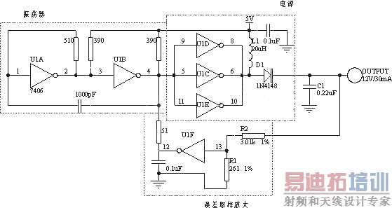 如图所示的电路用一个TTL六反相器即可构成一个DC/DC变换器,将5V变成12V。该电路提供了DC/DC变换所需的所有功能。
