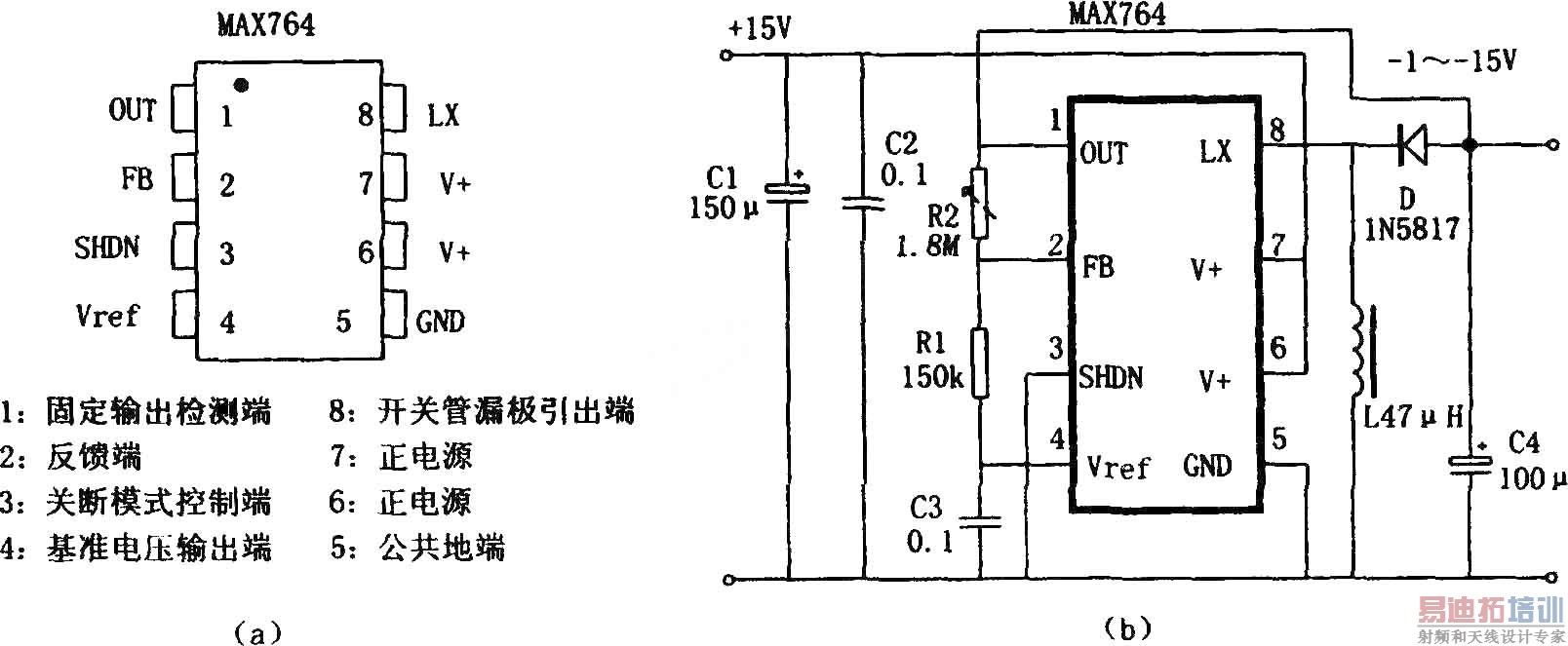 如图所示为采用MAX764构成的可调式极性反转电源。MAX764是一种高效率、低功耗、输出可调式直流电源变换器,它采用电流控制型脉频调制器(PFM),并兼有脉宽调制器(PWM)的优点。利用外部储能电感、滤波电容和续流二极管构成极性反转电路,产生负压输出。输入电压在3~16V之间,输出电压可固定为-5V.还可设置成-15V可调。最大输出电流为250mA,效率达80%以上,静态电流为120μA,关断状态为5μA。MAX764的封装为DIP8,外形及管脚见图(a),具体DC/DC变换电路见图(b)。输出电压V0=-VREF×(R2/R4)。VREF为片内基准电压,VREF=1.5V。