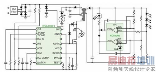 图3 基于NCL 30001 LED驱动器和NCS1002控制器的90w LED驱动器演示电路