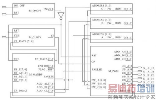 整个系统主要由开关模块M_ONOFF、可控时钟分频器M_CLOCK、反馈调制模块M_MANDP、脉冲宽度数值存储器A、B、C:PW_ROM和脉冲发生器M_PWM等模块按一定逻辑对接而成,如图3所示形成了逆变控制逻辑电路的顶层设计文件M_TOP_SPWM,可实现等效面积正弦波脉宽调制法设计所需的脉冲波形系列,用来控制开关器件IGBT的导通和截止状态。
