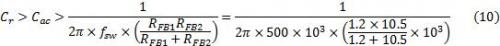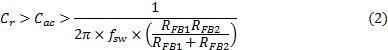 Cac 是为了除去 Cr 上的直流电平。从实验上看,Cac 不能太大,Cac 过大,输出电压的线性调整 率会变差。同时,当输入电压有低频波动时,输出电压上也会产生类似的低频波动,导致输出电压 纹波过大。根据 COT 模式,环路稳定的判据,可得: