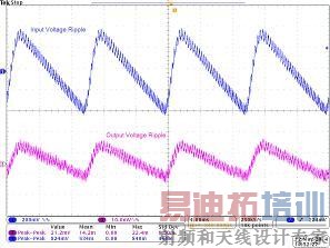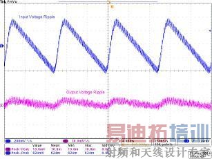 图 5. Cac 为 0.1uF 时,输入、输出电压纹波(400mA 输出,Rr 为 100kohm,Cr 为 3300pF)
