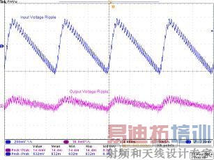 如图 8 所示,与图 7 相比,Rr 降为 49.9kohm,其输出纹波的峰峰值增大到 14.4mV。