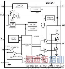 在新国网规范中,LM5017 需要面对的主要问题是:如何实现载波模块供电时的 1‰纹波输出。 LM5017 采用恒定导通时间控制(Constant On-time Control, COT),其内部框图如图 2 所示。