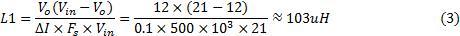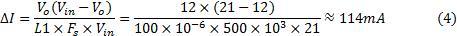 设输出电压上的纹波电流为 100mA,正常输入电压在 21V 左右,则输出电感为: