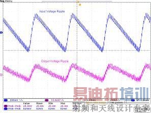 图 7. Cac 为 470pF 时,输入、输出电压纹波(400mA 输出,Rr 为 100kohm,Cr 为 3300pF)