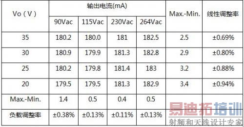 由上表可知,此方案在满载84V 176V~264V输入时线性调整率为±0.14%.