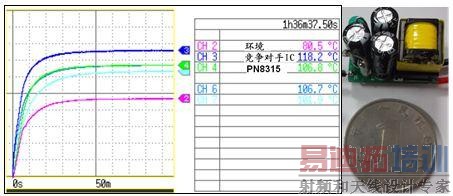 图3 PN8315 110V120mA LED驱动方案温升曲线及实物图