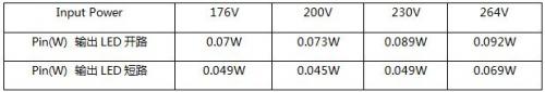 下表是输出LED开短路时的该方案输入端功率数值,说明系统将进入打嗝/锁定安全模式直到短路状态消除,能够做到比竞争产品的无法直接采样输出电压的保护机理要更加安全。