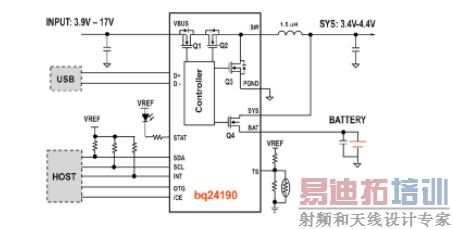 图 1 是 4.5A 高效率开关模式充电器的简化应用电路图。该充电器可同时支持 USB 和 AC 适配器,而且所有 MOSFET 均内部集成。MOSFET Q2 和 Q3 以及电感器 L 组成了基于同步开关降压的电池充电器。这种组合能尽可能实现最高的电池充电效率,而且能充分运用适配器功率实现最快的充电速度。MOSFET Q1 可用作电池反向阻断 MOSFET,防止电池通过 MOSFET Q2 的体二极管漏电到输入端。此外,它还可用作能监控适配器电流的输入电流感测元件。MOSFET Q4 可用于主动监控电池充电电流。设计中使用的全部 FET 应有足够低的导通电阻才能实现高效率。要进一步提升散热性能,还可采用散热稳压环路。当结温达到预定义的结温值时,其可通过降低充电电流来避免突破最大结温限制。