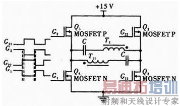 传统的全桥DC-DC拓扑由4只相同的开关管组成,需要2路互反的PWM控制信号,每路PWM信号驱动对角的2只开关管,2路PWM信号要求有死区,避免全桥直通。全桥拓扑的上桥臂驱动必须隔离,否则无法完成正确驱动,隔离电路一般采用光耦或磁性器件实现,电路复杂、体积大。设计采用2个电源变压器原边绕组共用一个全桥开关,由于系统为+15 V单电源输入,因此全桥开关采用2片内含PMOS和NMOS的S14532ADY实现,此时PWM驱动脉冲无需隔离,即不用将全桥的上下臂驱动脉冲进行隔离,使用振荡电路的逻辑门进行驱动,简化了控制电路,同时该全桥开关为小体积的SO-8封装,实现了最小PCB设计。据此原理设计全桥开关需要4路PWM 脉冲驱动,分为2组,每组内互反,驱动对角的PMOS和NMOS开关,2组之间带有死区,具体的4路。G11、G2、 G22、G1为4路PWM驱动,T1、T11为两个DC-DC电源变压器,此处只画出了原边绕组,C为隔直电容,能够有效地防止变压器磁芯饱和。可以看到,对角的开关同时导通,两组对角交替开关,两个变压器磁芯工作在I、Ⅲ工作象限,双向励磁,有利于实现高功率密度。